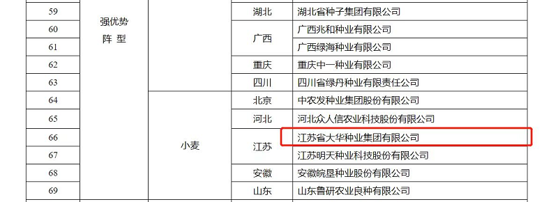 • 為貫徹黨中央、國務(wù)院種業(yè)振興決策部署,深入實(shí)施種業(yè)企業(yè)扶優(yōu)行動(dòng),近日農業(yè)農村部辦公廳印發(fā)《關(guān)于扶持國家種業(yè)陣型企業(yè)發(fā)展的通知》,根據企業(yè)規模、創(chuàng )新能力和發(fā)展潛力等關(guān)鍵指標,從全國3萬(wàn)余家種業(yè)企業(yè)中遴選了69家農作物、86家畜禽、121家水產(chǎn)種業(yè)企業(yè)機構,集中力量構建“破難題、補短板、強優(yōu)勢”國家種業(yè)企業(yè)陣型,加快打造種業(yè)振興骨干力量。江蘇省大華種業(yè)集團有限公司入選“國家農作物種業(yè)陣型企業(yè)·強優(yōu)勢陣型(小麥)”。
