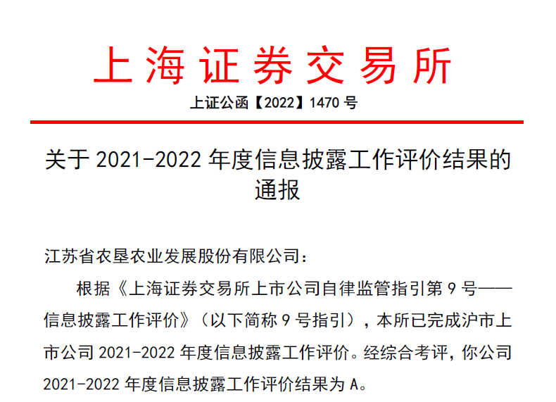 • 近日,上海證券交易所公布滬市主板上市公司2021-2022年度信息披露工作評價(jià)結果,蘇墾農發(fā)(股票代碼:601952)獲評最高等級“A”級,這是蘇墾農發(fā)連續第三年獲得信息披露工作最高等級評價(jià)。