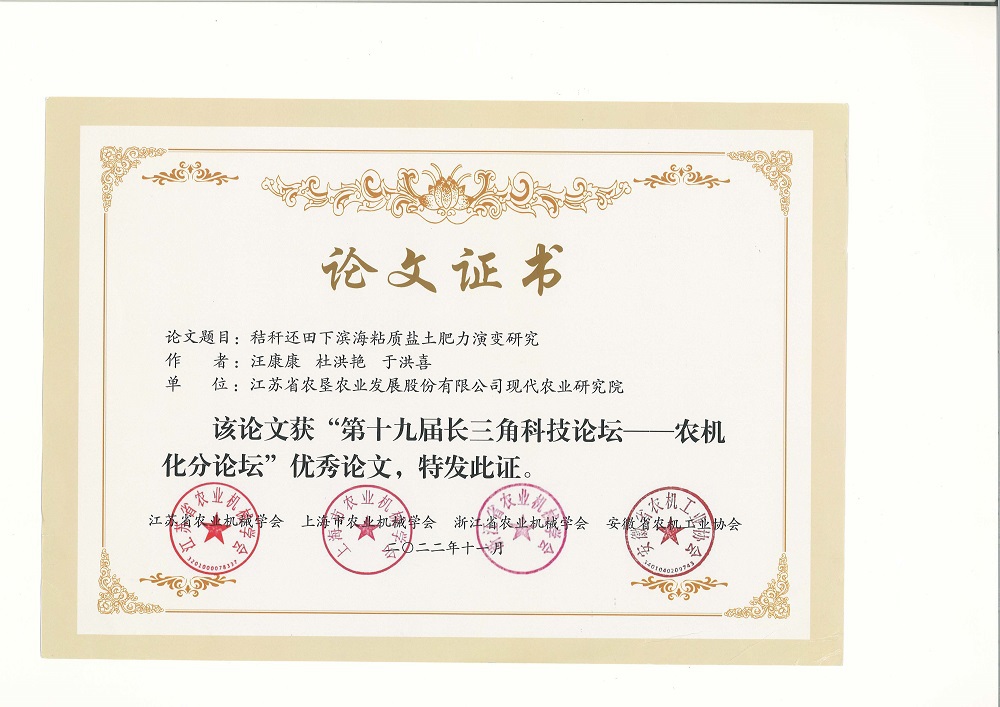 11月21日,江蘇省農業(yè)機械學(xué)會(huì )、上海農業(yè)機械學(xué)會(huì )、浙江省農業(yè)機械學(xué)會(huì )、安徽省農機工業(yè)協(xié)會(huì )發(fā)布了《關(guān)于表彰“第十九屆長(cháng)三角科技論壇-農機化分論壇”優(yōu)秀論文的決定》(蘇農機學(xué)會(huì )〔2022〕12號),江蘇省農墾農業(yè)發(fā)展股份有限公司現代農業(yè)研究院為第一單位的兩篇科技論文 “稻麥輪作下耕作方式對黏性土壤化學(xué)性質(zhì)及作物產(chǎn)量的影響” “秸稈還田下濱海黏質(zhì)鹽土肥力演變研究”獲得“第十九屆長(cháng)三角科技論壇-農機化分論壇”優(yōu)秀論文獎。