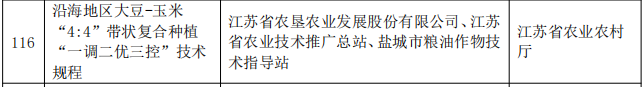 2022年蘇墾農發(fā)承擔了10萬(wàn)畝玉米大豆帶狀復合種植任務(wù),占江蘇省的1/6,開(kāi)創(chuàng )性提出了“寬窄行4:4”玉米大豆帶狀復合種植模式,配套研發(fā)6種不同結構的專(zhuān)用農機,實(shí)現了玉米大豆“定向化除”,形成了一套措施合理、適用區域廣、示范性強的技術(shù)模式,《沿海地區大豆-玉米“4:4”帶狀復合種植“一調二優(yōu)三控”技術(shù)規程》作為全省第一個(gè)以玉米大豆帶狀復合種植立項的省級地方標準,具有較強的生產(chǎn)推廣價(jià)值和實(shí)踐應用基礎。