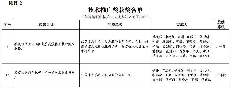 •       12月11日,第六屆江蘇省農學(xué)會(huì )科技獎勵成果獎和第六屆江蘇省農學(xué)會(huì )科技獎勵人才獎獲獎名單公布,蘇墾農發(fā)作為第一完成單位申報的“稻麥植保無(wú)人飛防高質(zhì)高效作業(yè)技術(shù)集成與推廣”成果榮獲技術(shù)推廣獎二等獎、“江蘇農墾綠色低碳生產(chǎn)關(guān)鍵技術(shù)集成與推廣”成果榮獲技術(shù)推廣獎三等獎,蘇墾農發(fā)現代農業(yè)研究院朱松同志榮獲青年科技獎。
